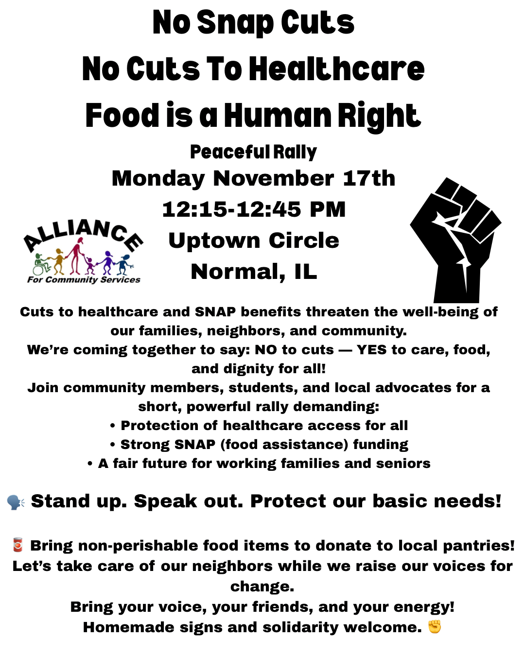If you want to help your neighbors in McLean County experiencing food insecurity, here is a site to find all the food pantries in the Bloomington/Normal area: | Eat. Move. Save. | UIUC (run by the University of Illinois Extension), or you can participate in this food drive, which aims to feed anyone who needs it, regardless of ID: